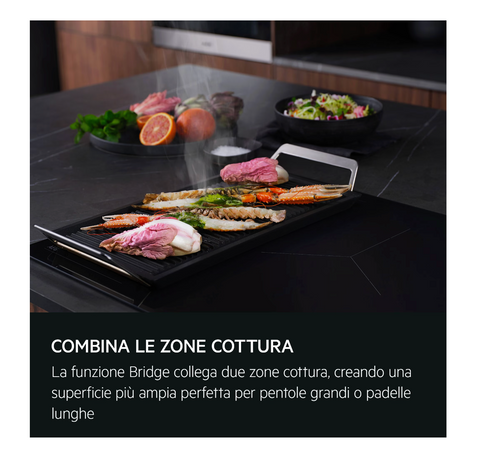 - Funzioni di controllo: Assorbimento massimo regolabile, Blocco impostazioni di cottura, -, Indicatore calore residuo, Timer, Segnale Acustico, Funzione potenza aggiuntiva, Funzione Bridge, Sicurezza Bambino