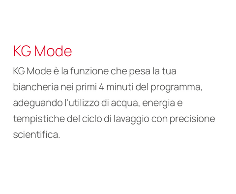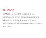 KG Mode è la funzione che pesa la tua biancheria nei primi 4 minuti del programma, adeguando l'utilizzo di acqua, energia e tempistiche del ciclo di lavaggio con precisione scientifica.