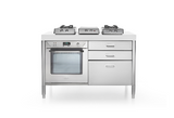 L’elemento cottura può avere il top inox, le ruote, due o tre cassetti da 120cm, due ante da 60cm, ripiani a giorno fissi od estraibili. Consente l’inserimento di diversi modelli di piani cottura.