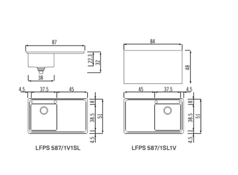 Ⓜ️🔵🔵🔵👌 Alpes LFPS 587/1V1SL oppure LFPS 587/1SL1V - Lavello da incasso filo piano 51x87 cm con una vasca raggio 12 posizionata a sinistra o destra e uno scivolo liscio. Predisposto con foro per la rubinetteria